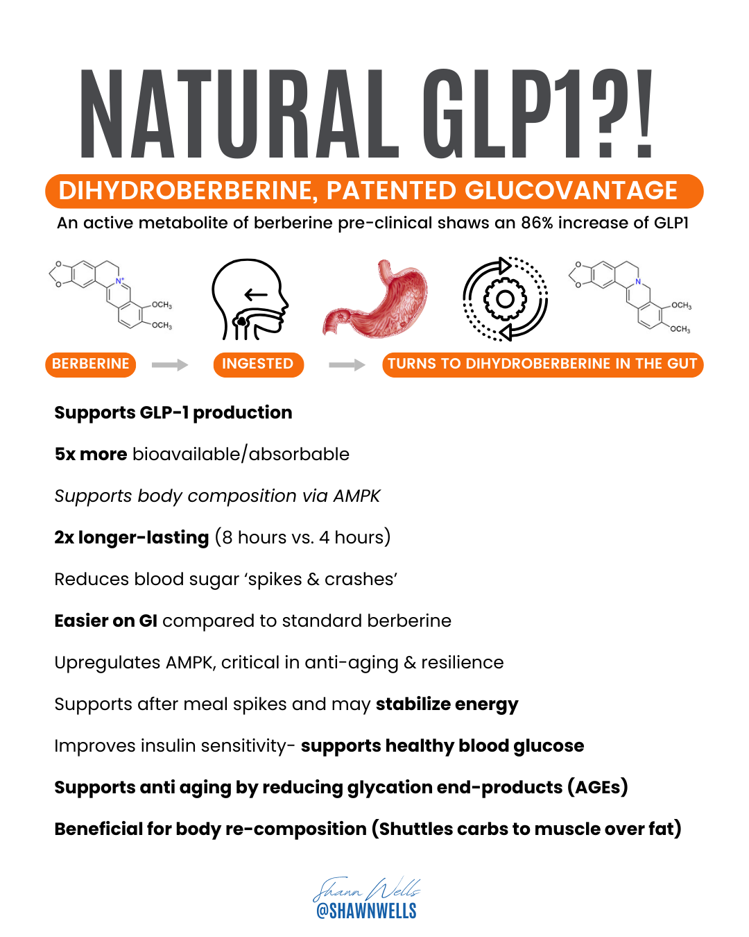 When it comes to natural GLP-1 support, GlucoVantage® (the patented form of dihydroberberine) is an ingredient I personally look for—and use—because of its proven bioavailability, low GI side effects, and consistent performance in both research and real-world settings.