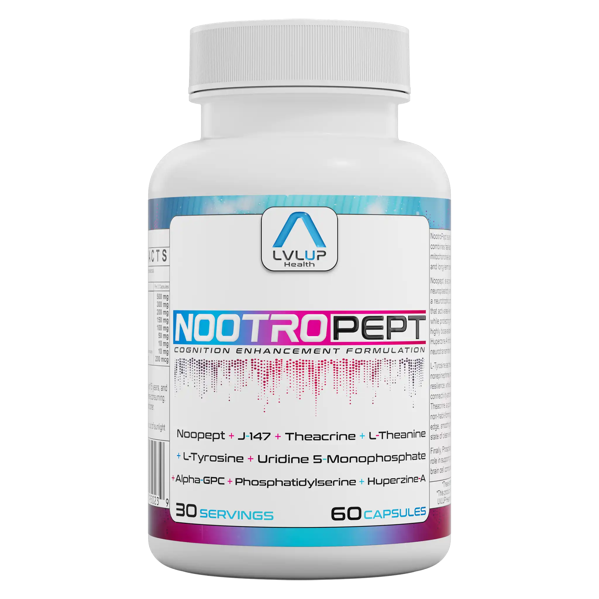 Supports focus, memory, and neural signaling with noopept, J-147, alpha-GPC, phosphatidylserine, theacrine, and L-theanine. Provides fast and sustained cognitive clarity by aiding neurotransmitter production and stress resilience without overstimulation.